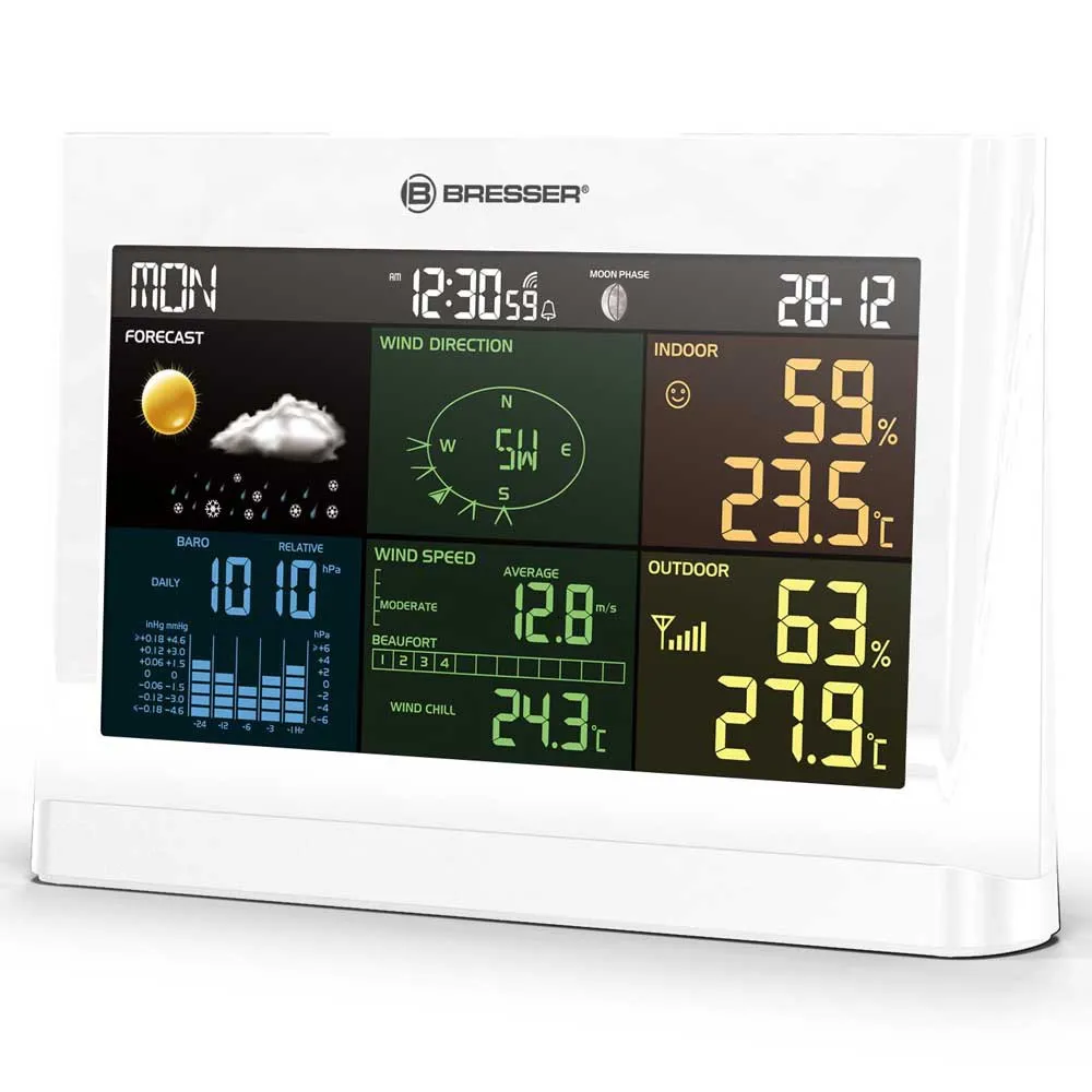 The new Bresser weather center 5-in-1 combines in a unique way a compact design with an extensive information service. The very compact and multifunctional outdoor sensor requires only little space and thus can be placed almost anywhere. A pipe clamp and screws for the attachment at poles (pipe diameter of about 25-33 mm) as well as a stand are already included!