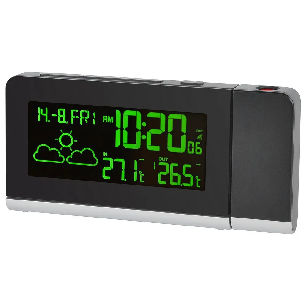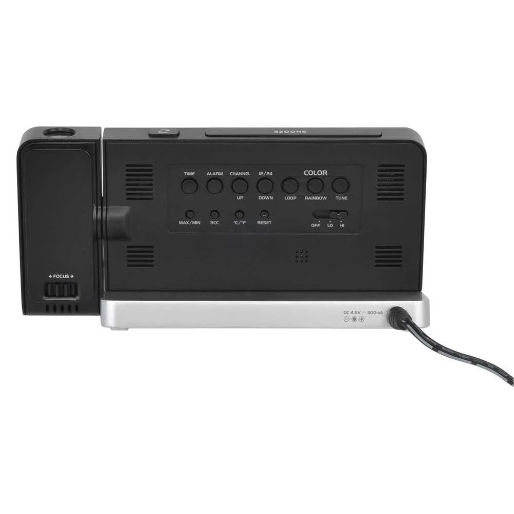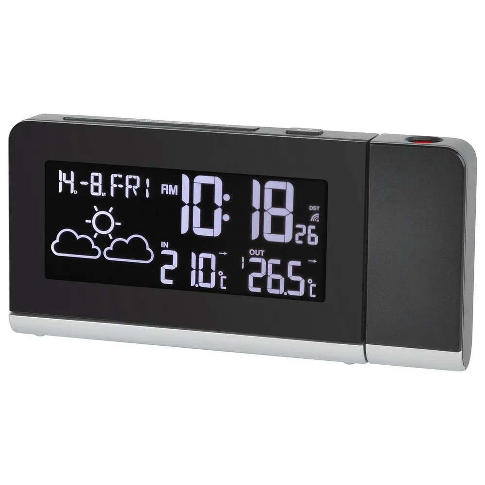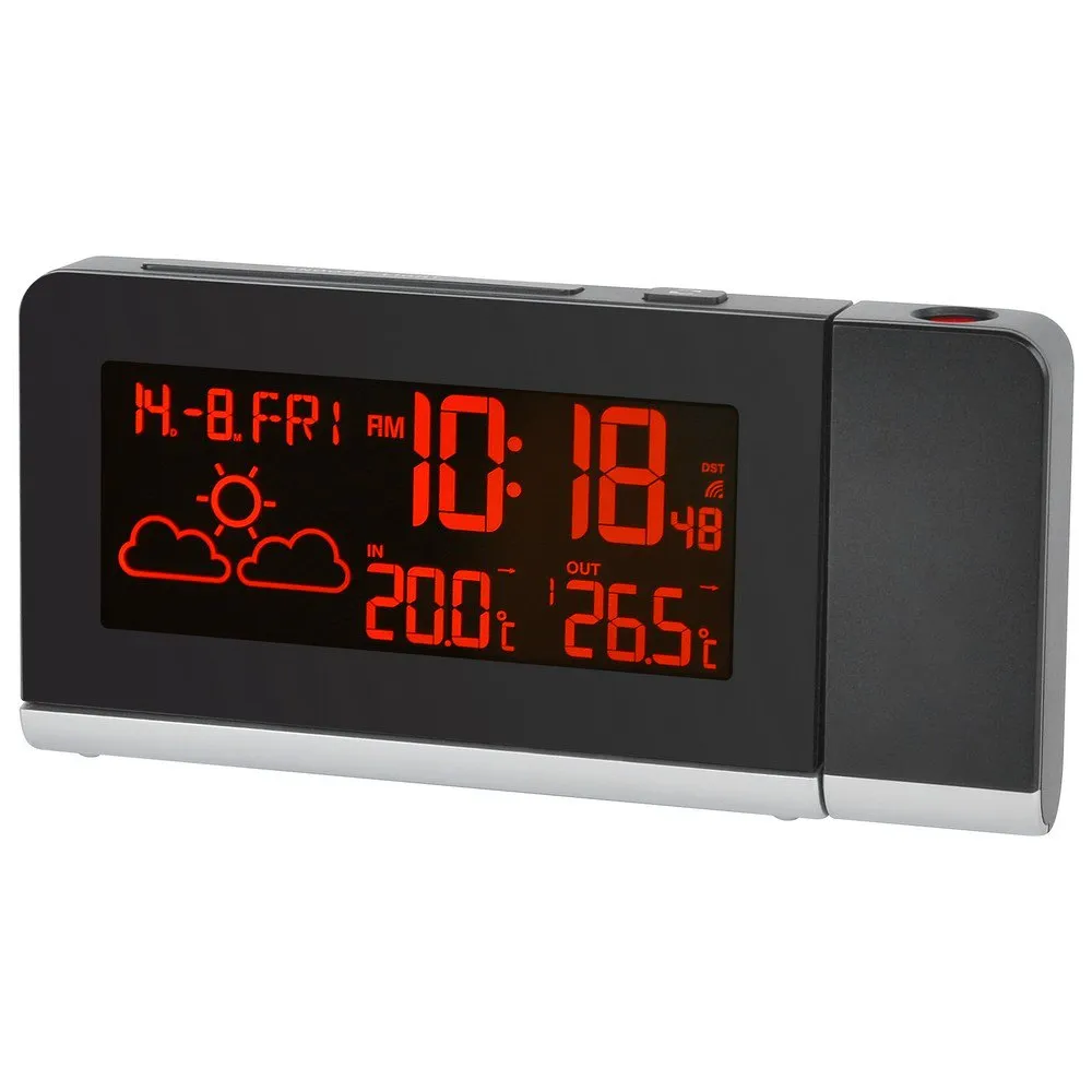 With the integrated projector the current time as well as inside and outside temperature can be projected onto the ceiling or wall. Even with the display deactivated one can read the most important information from the red light projection which is kind to the eye. With the included power supply the projection can be switched on permanently, when powered by battery the projector turns off automatically after a few seconds to save energy.