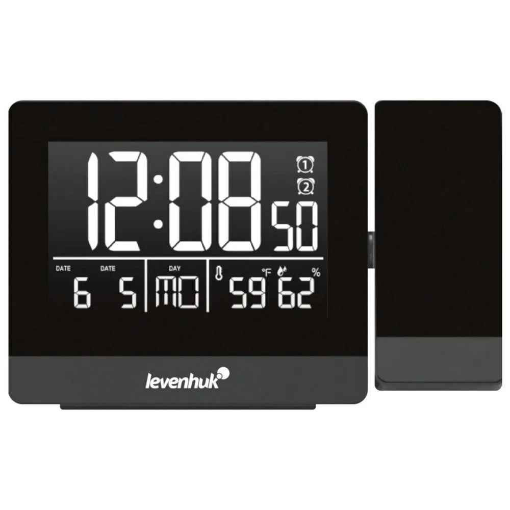The Levenhuk Wezzer BASE L70 has an alarm clock with two independent alarms. If you wish, you can have the alarm repeated with the snooze function at the touch of a button. The practical LCD display shows all the necessary information: Time, date, day of the week, room temperature and humidity. The unit works with batteries or mains power. When the unit is operated with mains power, continuous backlighting of the display is available.