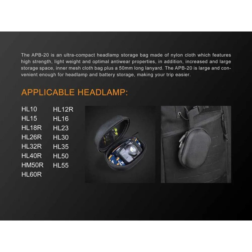 The storage case for your Fenix ​​fronts has already arrived. The Fenix ​​APB-20 is an ultra-compact front storage bag that fits most Fenix ​​front panels. The front bag is easy to use and also has a multi-purpose storage pocket that can be used to store different accessories or batteries. The Fenix ​​APB-20 is made of durable nylon fabric, which makes it very strong and lightweight. This is a perfect front bag for camping, walking or traveling. Includes a 50 mm cord for easy transport.
