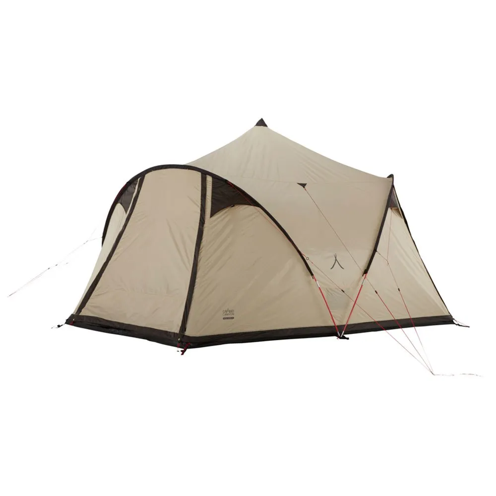 – The central upright tepee pole is accompanied by three identical pole arcs forming three identical entrances and providing stand-up height throughout the main tent area.