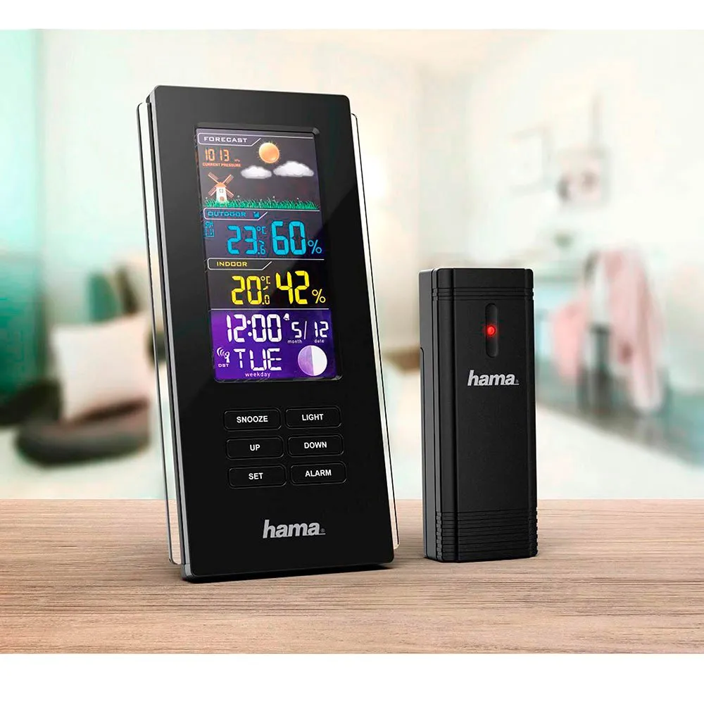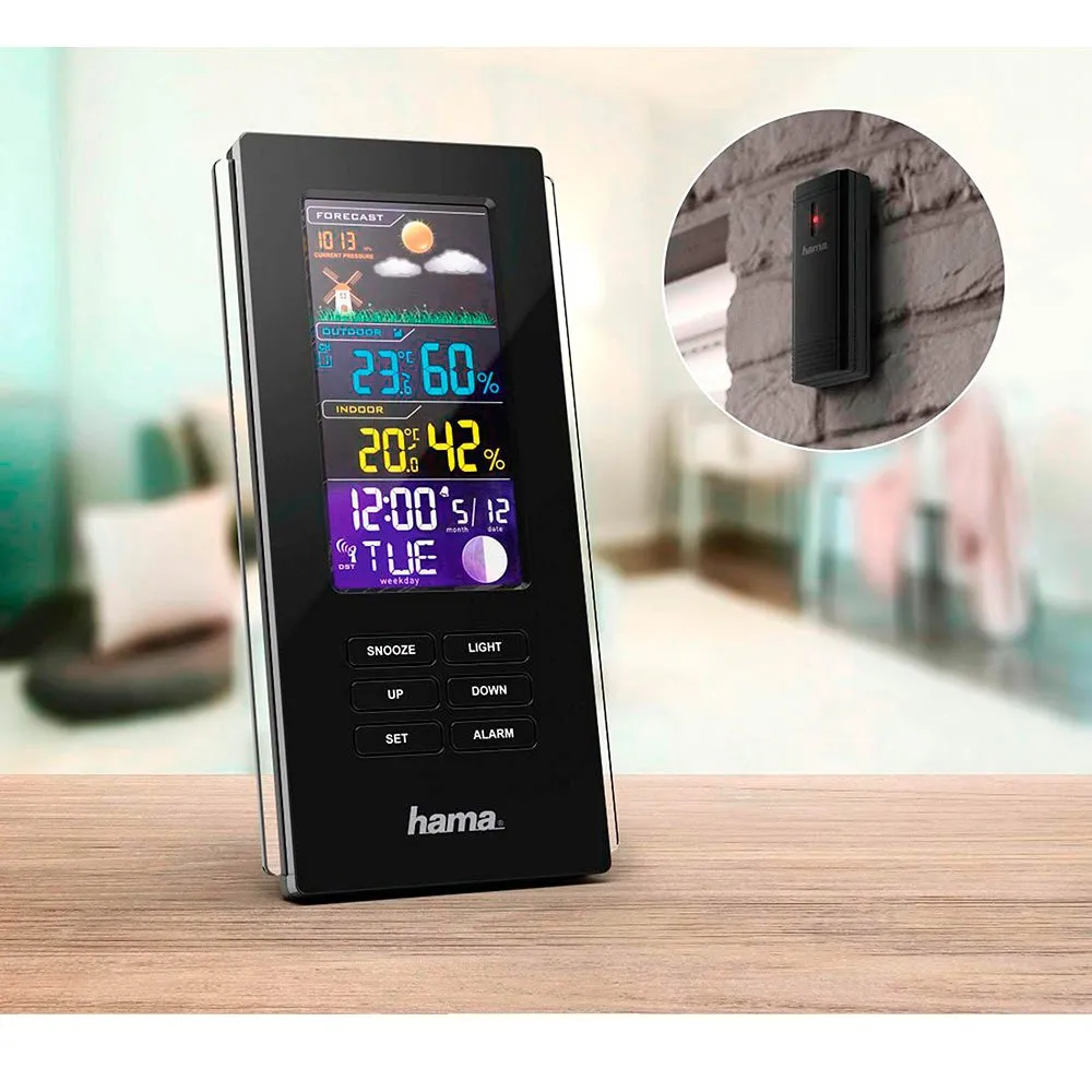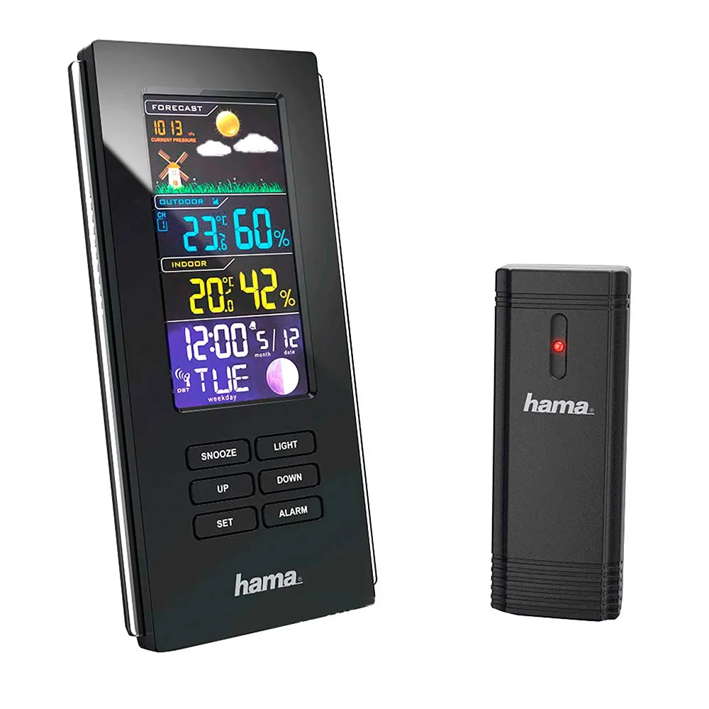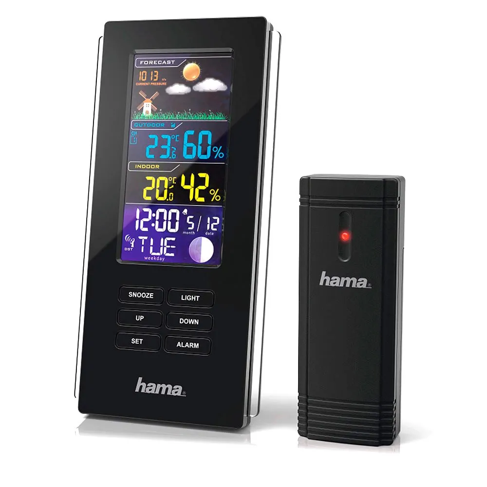 – two-piece set, consisting of base station and radio sensor, for displaying weather forecast, air pressure, temperature, humidity, time, date and weekday