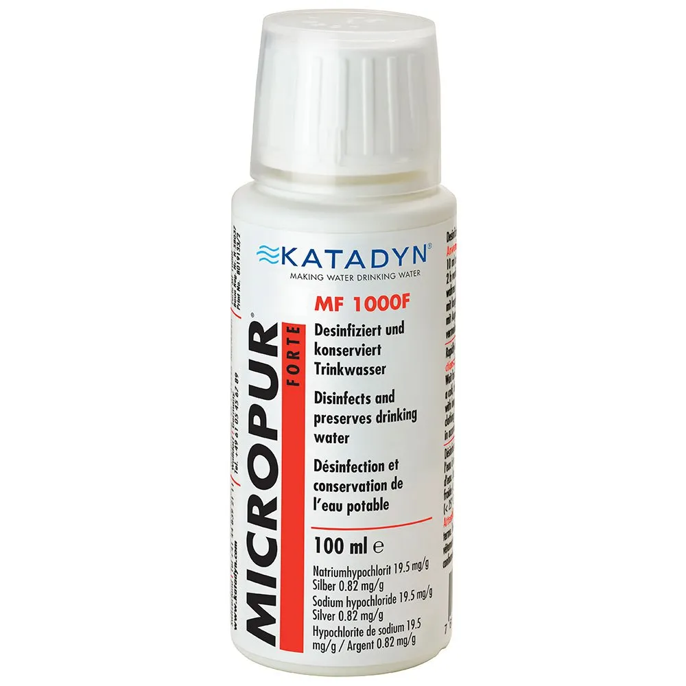 KATADYN Micropur Forte Mf 1000F Purification Liquid 100ml is a top-of-the-line water purification solution designed for hikers, travelers, and outdoor enthusiasts. The liquid comes in a compact and easy-to-carry packaging that perfectly fits in your backpack or luggage.The liquid is formulated with Chlorine Dioxide which is highly effective in killing bacteria, viruses, and other harmful microorganisms present in water, thereby making it safe for consumption. The KATADYN Micropur Forte Mf 1000F Purification Liquid 100ml is effective against bacteria like E.Coli, cholera, and Salmonella, and viruses like Norovirus, Hepatitis A, and Rotavirus.This purification liquid from KATADYN is very easy to use. Simply add the recommended dose to the water and wait for some time (the waiting time may vary depending on the water temperature, quality, and turbidity). The liquid is also effective in neutralizing any unpleasant taste and odor in water, making it pure and clean to drink.With a bottle of KATADYN Micropur Forte Mf 1000F Purification Liquid 100ml, you can purify up to 1000 liters of water, which makes it a cost-effective and convenient solution for those frequently on-the-go. You can use it to purify water from any source, including taps, wells, lakes, and streams.In sum, KATADYN Micropur Forte Mf 1000F Purification Liquid 100ml is a reliable and efficient water purification solution that ensures clean and safe drinking water anywhere you go.
