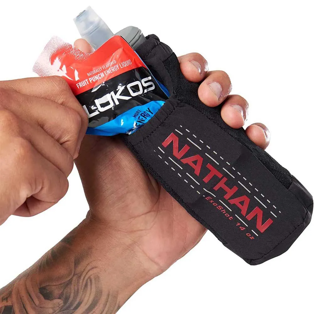 – 14oz. BPA-Free soft flask with bite valve can be easily removed from sleeve and used in NATHAN hydration vest pockets.