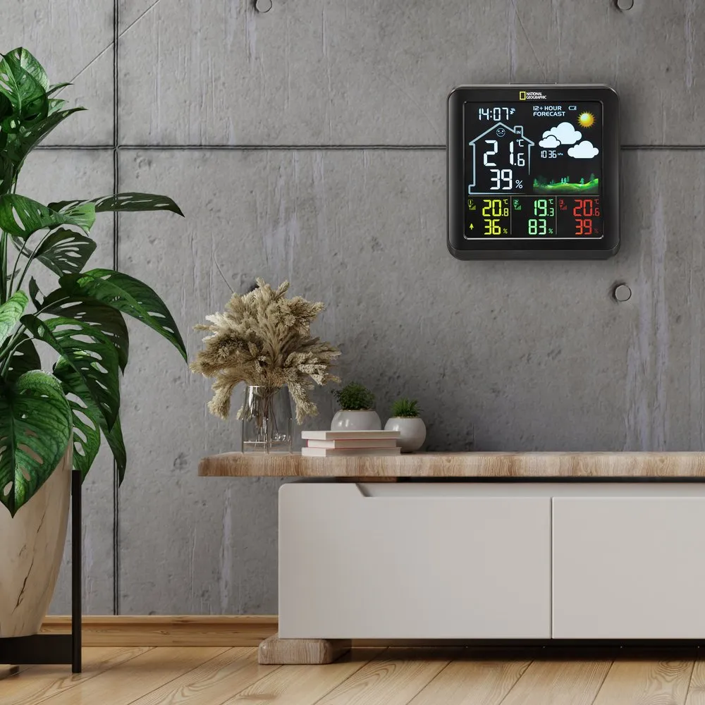 The National Geographic Va Colour Weather Station With 4 Measuring Points In Black Displays All Relevant Weather Data At A Glance. The Set Includes 3 Outdoor Sensors And One Built In Sensor. On The Clearly Arranged Colour Display You Will Find Information Such As Temperature And Humidity For Indoor As Well As Outdoor, As Well As The Exact Time Via Dcf Radio Transmission. Besides The Built In Sensor In The Console Unit (Display) The Station Is Able To Receive The Temperature And Humidity Readings From Three Additional Sensors Which Are Included In This Set. Its Use Is Therefore Very Versatile As The Sensors Can Be Placed Either In- Or Outdoors. What´s The Temperature In The Kids Room, Is The Basement Too Moist How Cold Is It Outside? All These Questions Can Be Viewed On One Display. The Station Has A Time Offset Function, So Although Parts Of The Uk Are Technically Able To Receive The European Dcf Time Signal (Southern England), Your Station Will Be Displaying The Uk Time. For All Parts Of The Uk Where The Time Signal Can Not Be Received The Time Can Easily Be Set Manually With This Station. The Featured Weather Forecast Is For The Coming 12-24h.