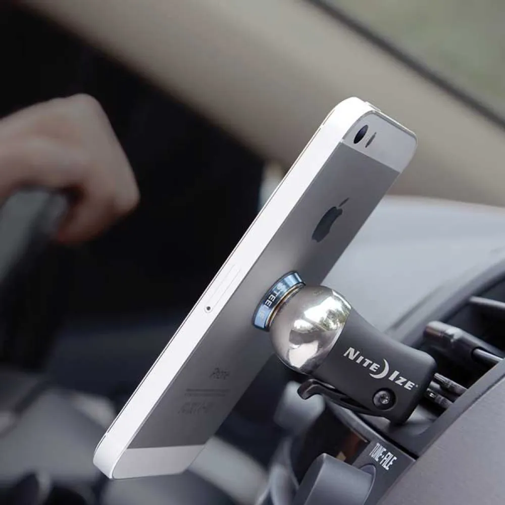 The Steelie Vent Mount Kit is a brilliant solution for keeping your smartphone secure and visible when youre in the car – any car. It consists of two simple components: 1) a Steelie Magnetic Phone Socket that adheres semi-permanently with 3M® VHBâ„¢ foam tape, either to the back of your case or to the phone itself, and 2) a versatile Steelie Vent Ball Mount that securely clips to most vehicle vents, and is just as easy to unclip, so it can be used in multiple vehicles. The Vent Balls round shape allows radiant positioning options, so you can tilt your phone to any angle, and the strong magnetic attachment of the Steelie Phone Magnet Socket keeps your phone securely in place and where you need it.