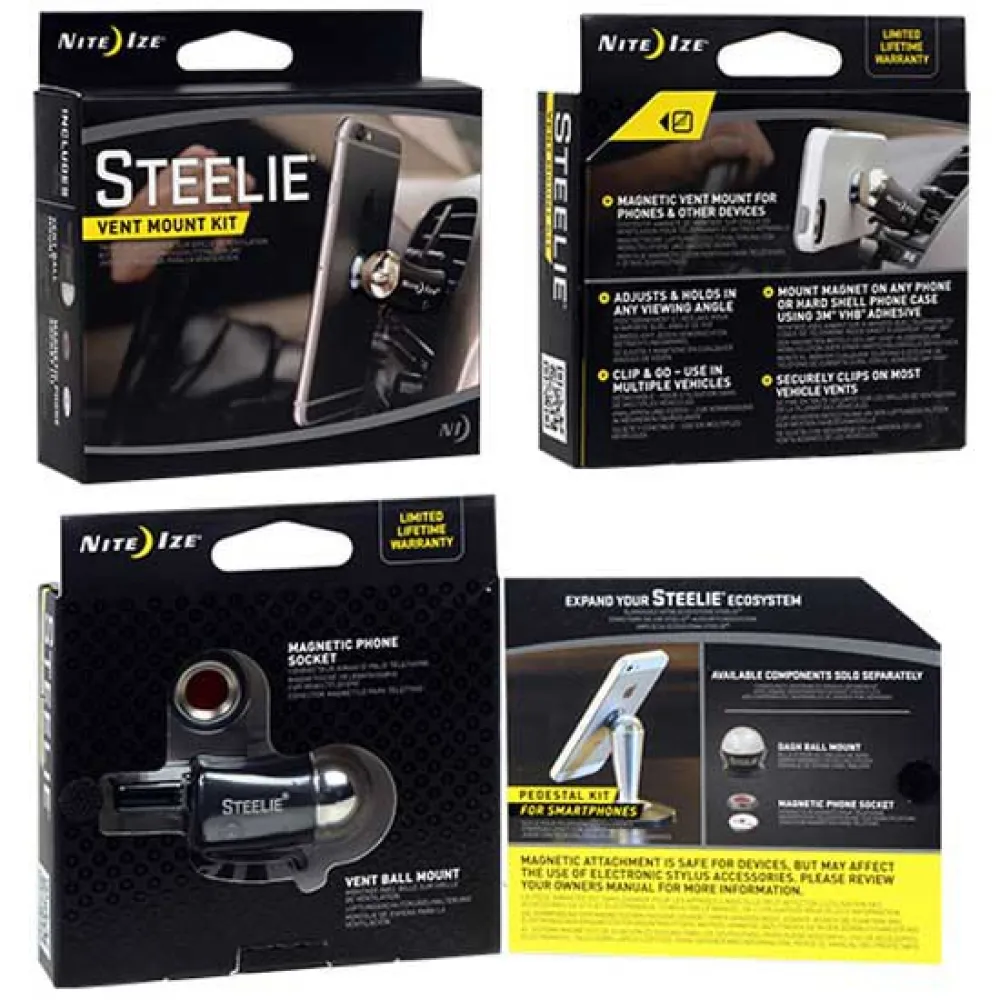– Each Steelie Vent Mount Kit includes one Steelie Vent Ball Mount, one Steelie Magnetic Phone Socket with 3M® VHBâ„¢ adhesive, and installation kit