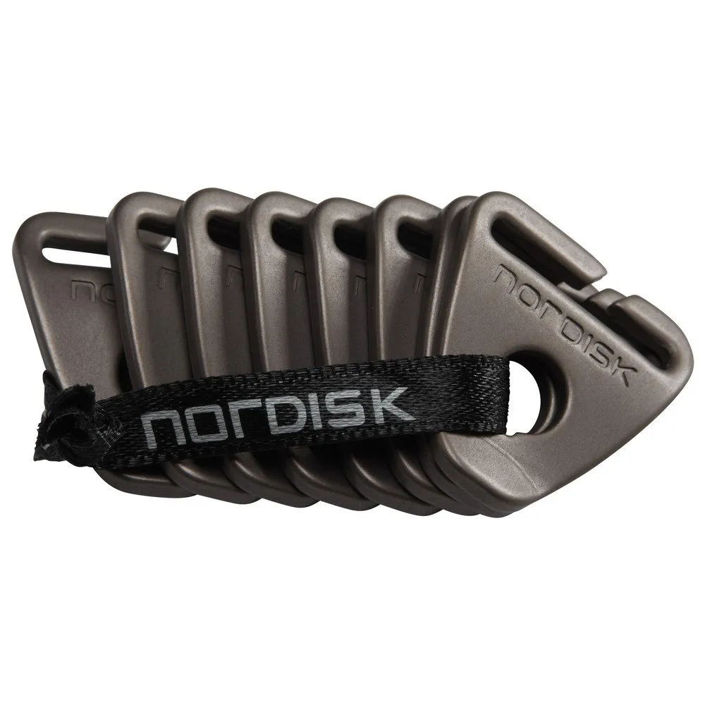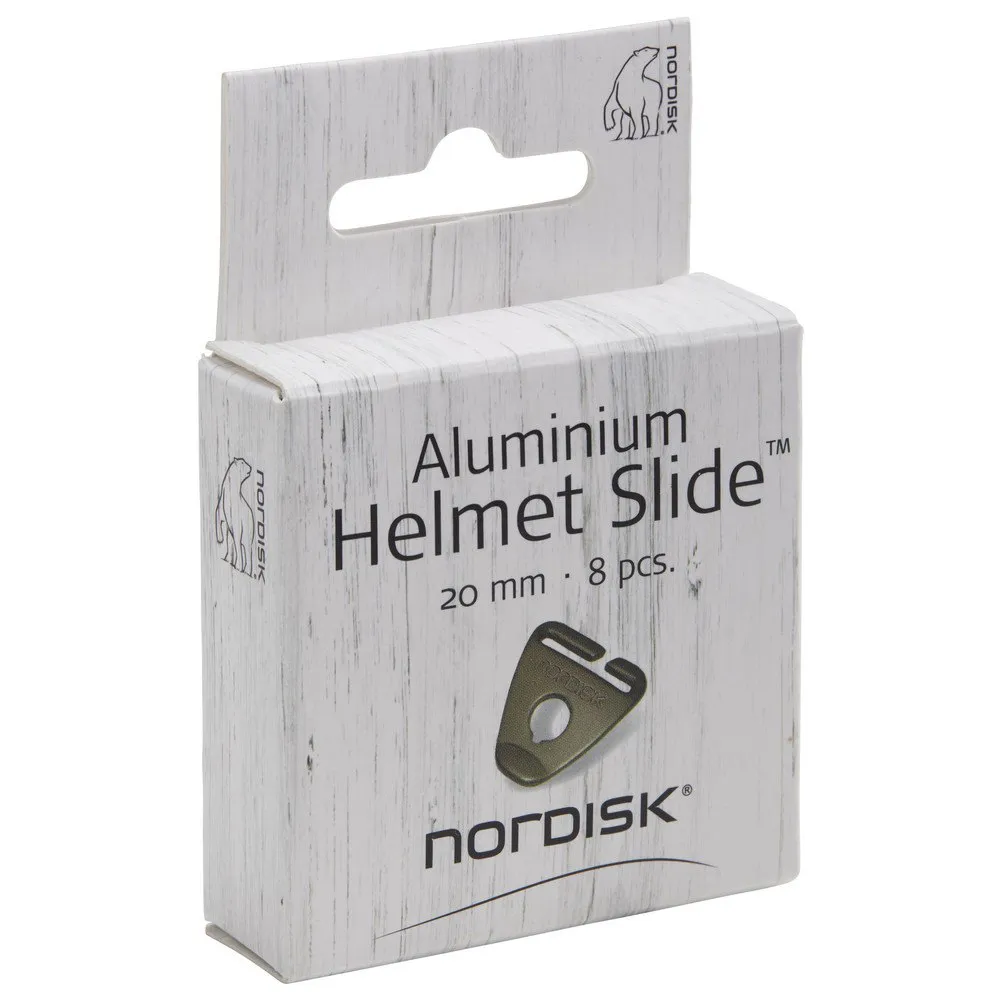 – Standard eyelets reduce the tensile strength of fabrics and webbings by up to 50%. The Helmet Slide – a small solid plate which functions as an “eyelet” you can put anywhere on your tarp without weakening the material. The Helmet Slides are easy to attach and to use – they are designed to hold a pole and a guy line simultaneously. All Nordisk tarps are produced Helmet-Slide-ready. All webbing loops (and handles) have a flat eye where a Helmet Slide can be hooked in from the side. Of course, the new Aluminium Helmet Slides can be used not only on Nordisk tarps and tents, but also on any other product featuring (webbing) loops or straps suitable for attaching the Helmet Slides.