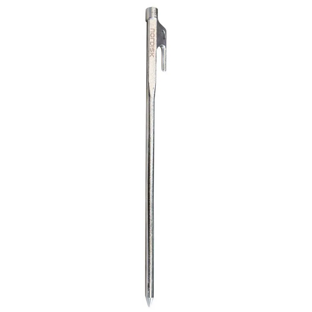 The steel nail is the perfect peg for all kinds of firm ground or ice. The slim design combined with a sharply pointed tip perforates into almost everything, and the reinforced body made of extra strong 9mm steel makes it both strong and durable. The steel nail is fitted with a hole at the top, which is dual purpose; the primary use is the attachment of a guy rope, but since the hole fits the diameter of the peg you can insert a second steel nail into the hole, making removal much easier. A great feature when using it for heavy tents and tarps on hard ground.