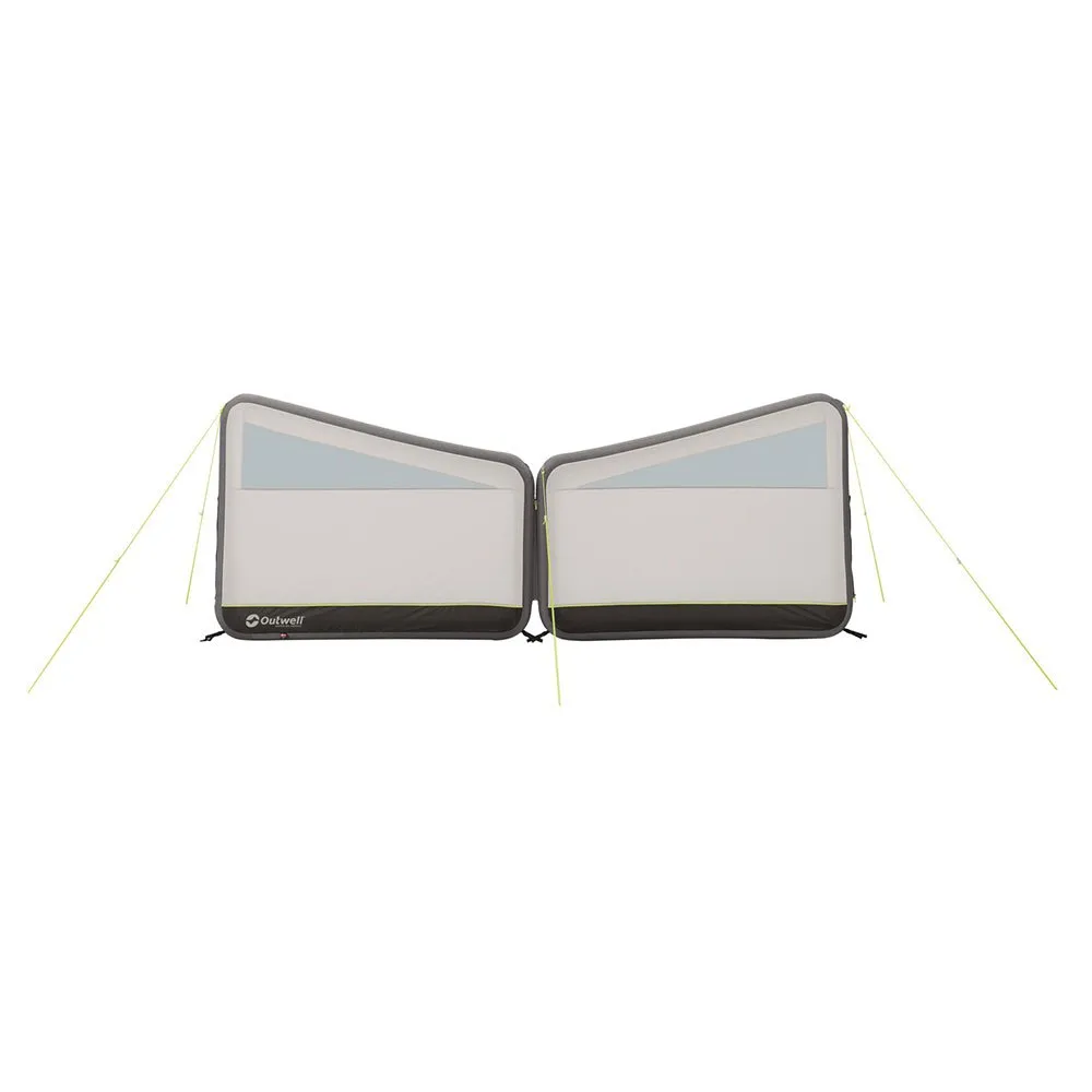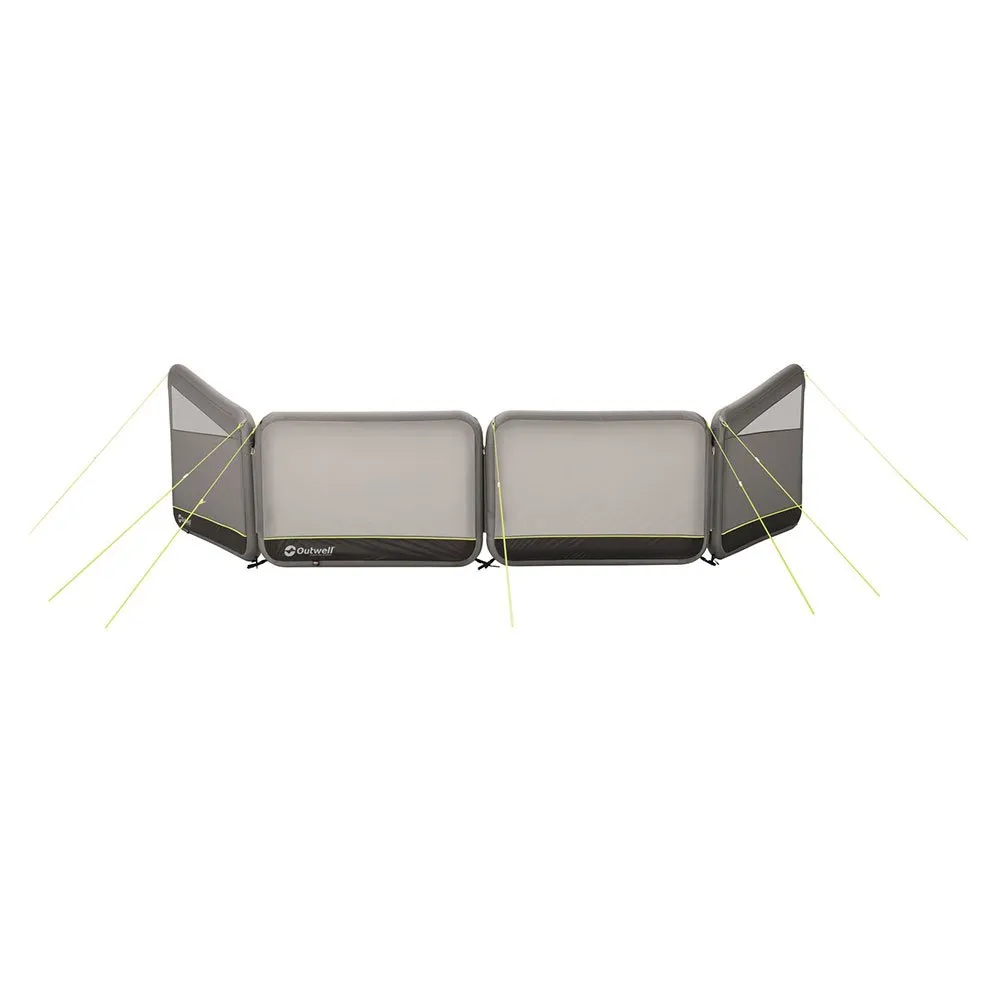 Modular inflatable windscreen with raked top for tailored protection and privacy to create a unique outdoor room.
