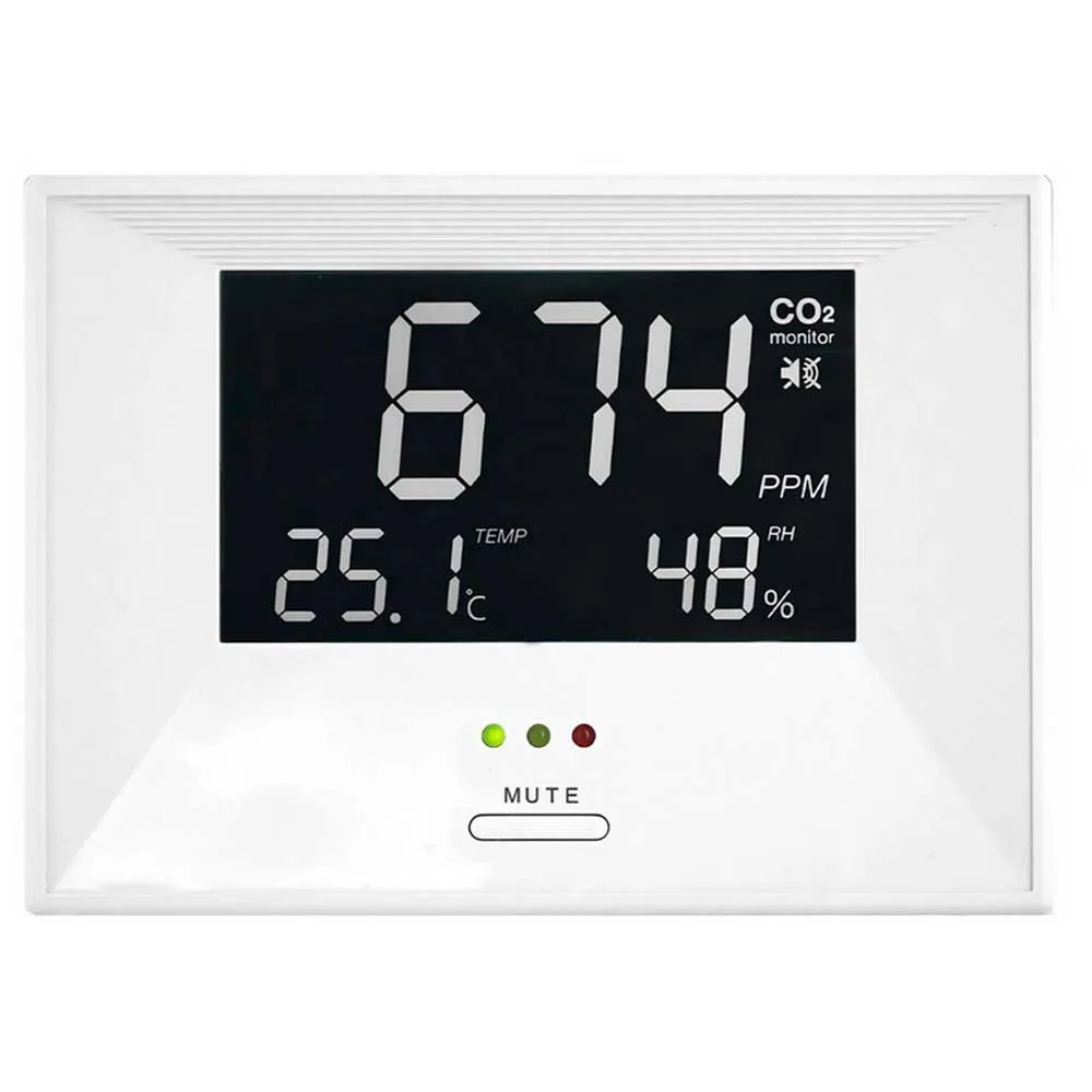 The monitor shows the CO2 content of the room air on an easy-to-read display. A coloured traffic light indicator below the display changes from green to yellow to red depending on the air quality. In addition, you are informed about temperature and humidity. It is possible to set an alarm.