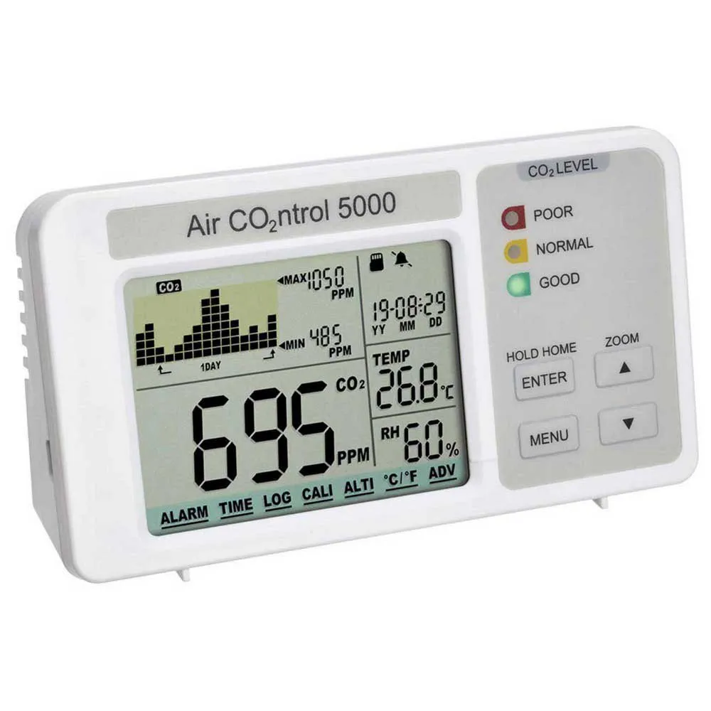 Who Breathes Good Air Is Healthier, Happier And Can Do More. Headaches, Dizziness And Permanent Fatigue Are Often Due To A High Concentration Of Co2 In The Air. With Airco2ntrol 5000 From Tfa, You Can Monitor How Stale And Contaminated The Air Is In Indoor Spaces Where Many People Are Present Such As In Schools, Offices And Public Buildings. Timely And Energy-Efficient Ventilation Ensures A Healthy Indoor Climate. The Airco2ntrol 5000 Is A Co2 Monitor With Data Logger Function Via Sd Card. In Addition To The Co2 Levels, The Device Measures The Temperature And Humidity Of The Environment And Informs You Of The Date And Time. The Display Shows The Current Co2 Levels As Well As A Graph With Past Values And The Associated Maximum And Minimum Values. The Bar-Graph Timeline Can Be Variably Set To One Minute, Hour, One Day Or Week. As An Option, The Last Measured Temperature And Humidity Values Can Also Be Clearly Displayed On The Graph. A Coloured Traffic-Light Display Allows The Interpretation Of The Co2 Values At A Glance And Changes From Green To Yellow And To Red Depending On The Air Quality And The Setting Of The Limit Values. If A Specified Maximum Value Is Exceeded, An Additional Warning Signal May Be Provided If The Co2 Concentration Levels Being Too High.