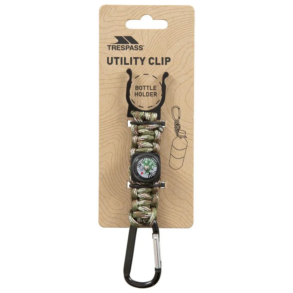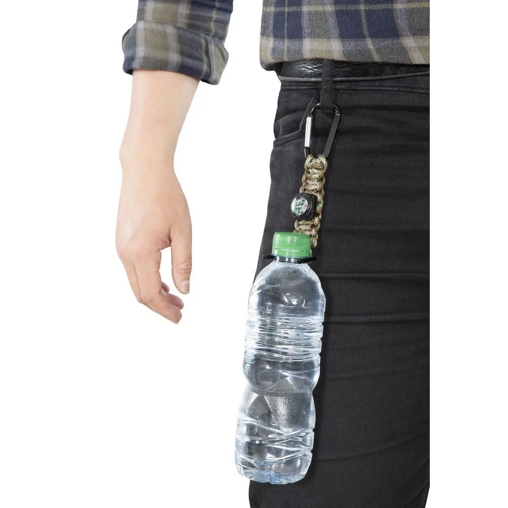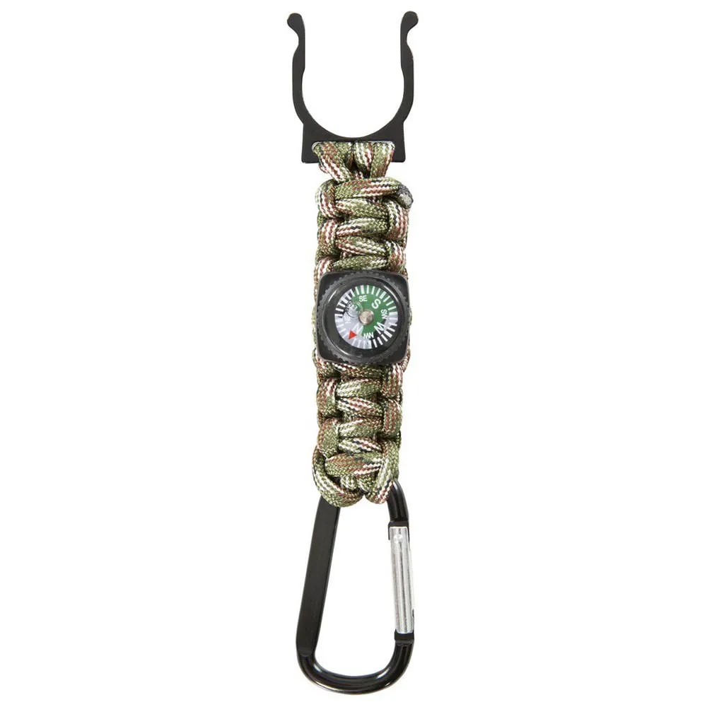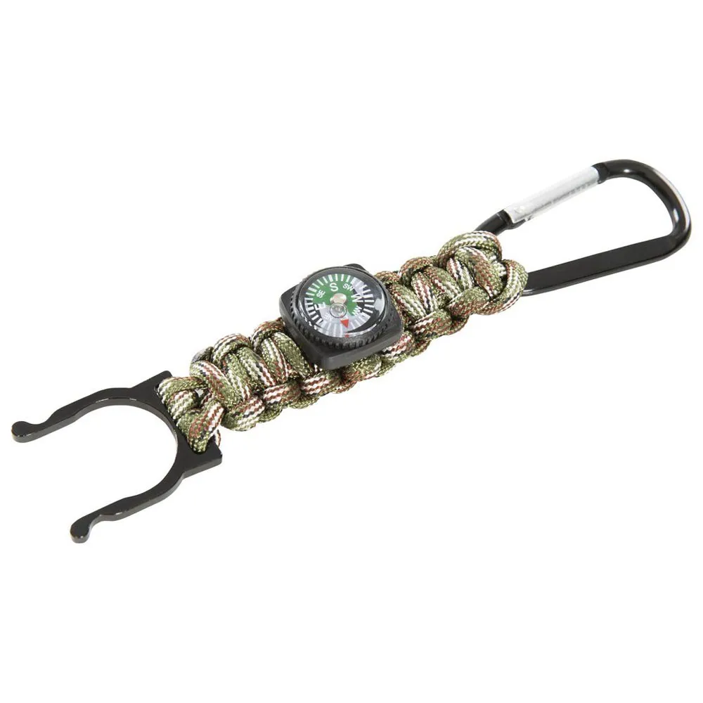 – Aluminium survival accessories, including a black bottle holder, a compass with camouflage-print dial and a black carabiner clip (not suitable for climbing).