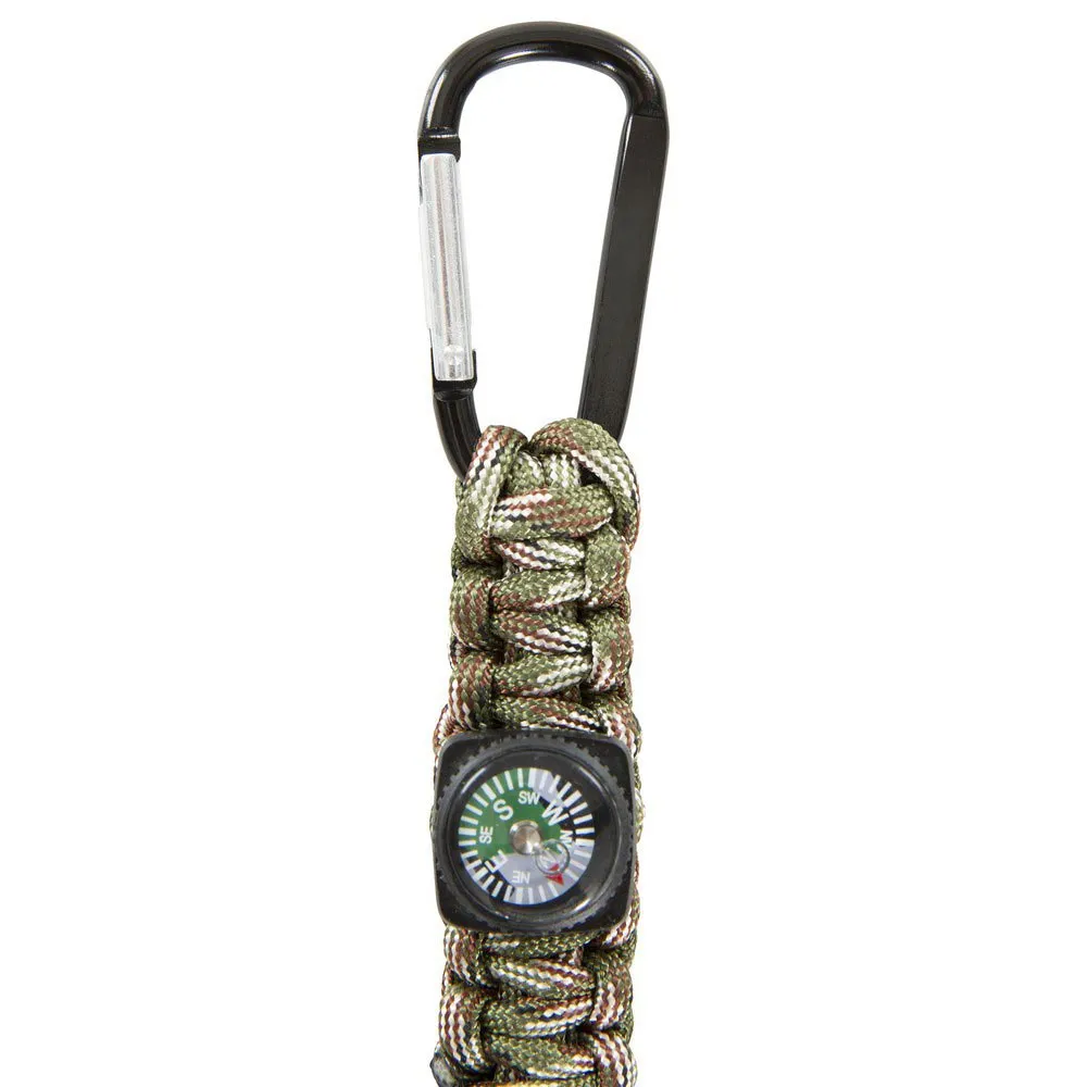 – 1.25 metres of plaited camo print paracord that has been Tensile strength tested to hold up to 550lbs.