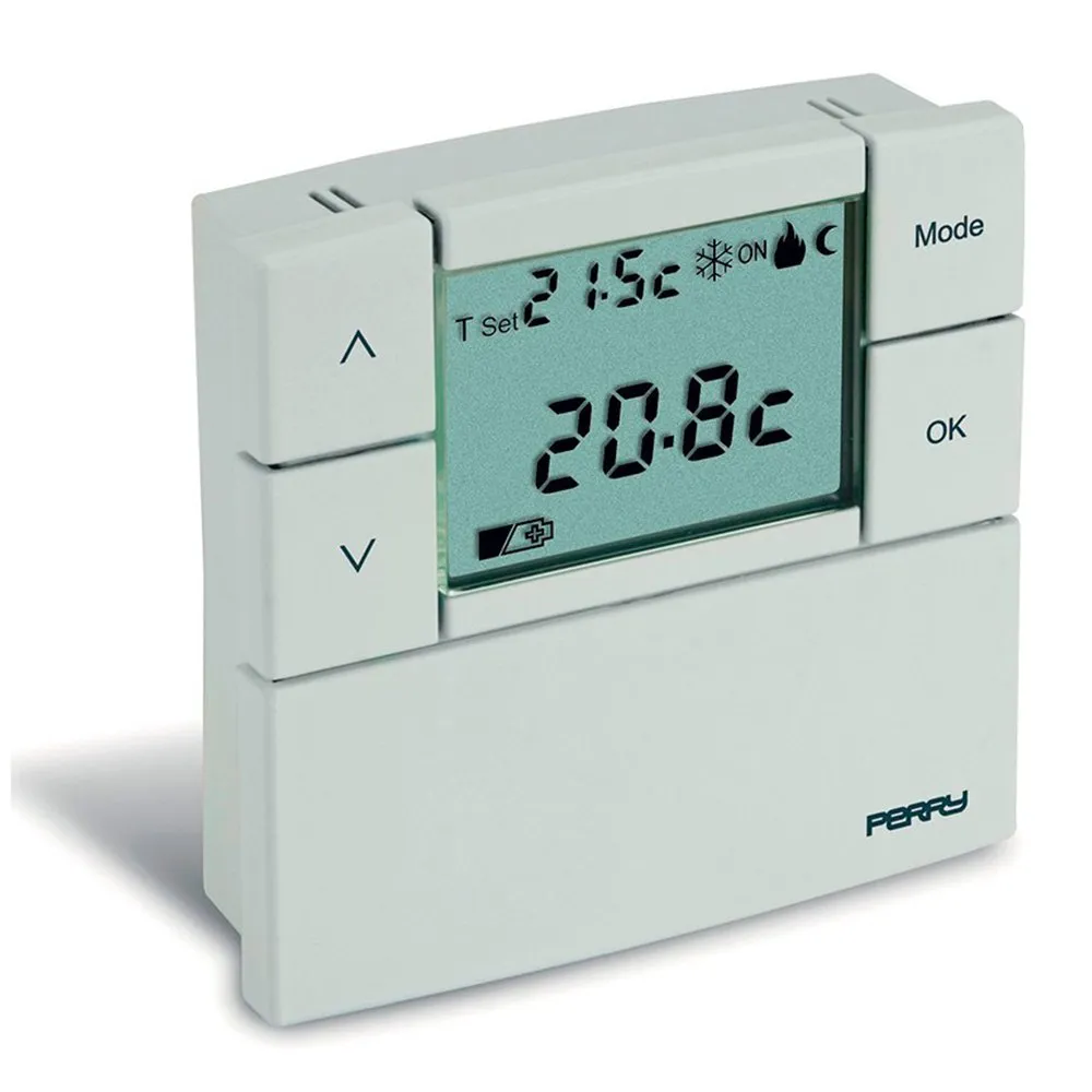 3v Digital Thermostat ´´Zefiro´´ Series 84x84mm White Color. 2 Temperature Levels + Antifreeze. Adjustable Temperature With Steps Of 0.1ºc. On / Off Operation With Adjustable Differential 0.2-2ºc Or Proportional With Control Interval Of 7/10/13/20 Minutes. Lcd Display 2nd 1/3. Low Battery Indicator. Relay Status Indicator. Summer / Winter Selector. Temperature Limits. Correction Of The T Measure According To The Situation Of The Device. Dimensions: 84x23x84mm. Power Supply 3v 2×1.5v Aaa. Perry.